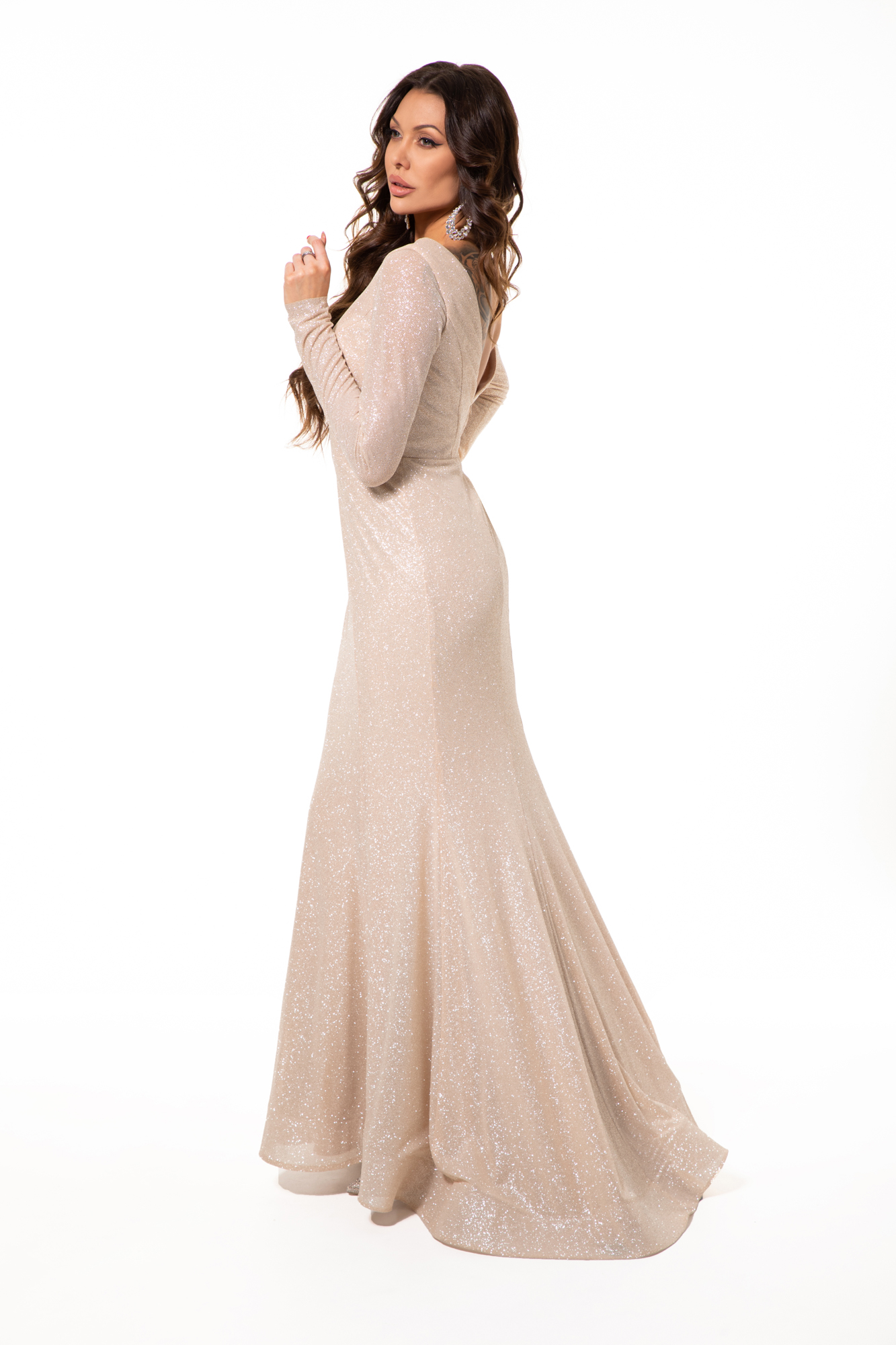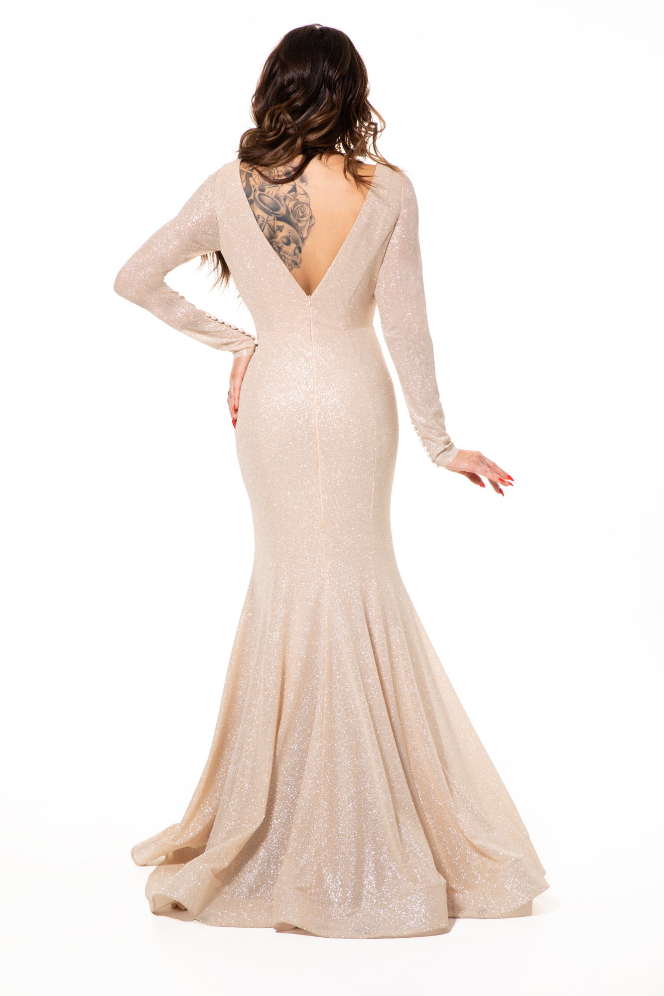 Suknia ASTERIA – spektakularna suknia w fasonie rybki z długim eleganckim rękawem oraz mocno wyciętym dekoltem w „literę V” z przodu i z tyłu. Przód dekoltu przysłonięty cielistego tiulu. Uszyta z dzianiny w kolorze beżowym pokrytej brokatową tkaniną. Dół sukni wykończony krynoliną dzięki czemu pięknie się układa. Suknia idealnie podkreśla kobiece kształty, a mieniąca się na srebrny kolor tkanina sprawia, że jest bardzo efektowna. Suknia idealna na wesela, poprawiny, czy wszelkiego rodzaju bale. Kryształowe kolczyki, klasyczne szpilki w kolorze nude i kopertowa torebka będą jej idealnym uzupełnieniem.