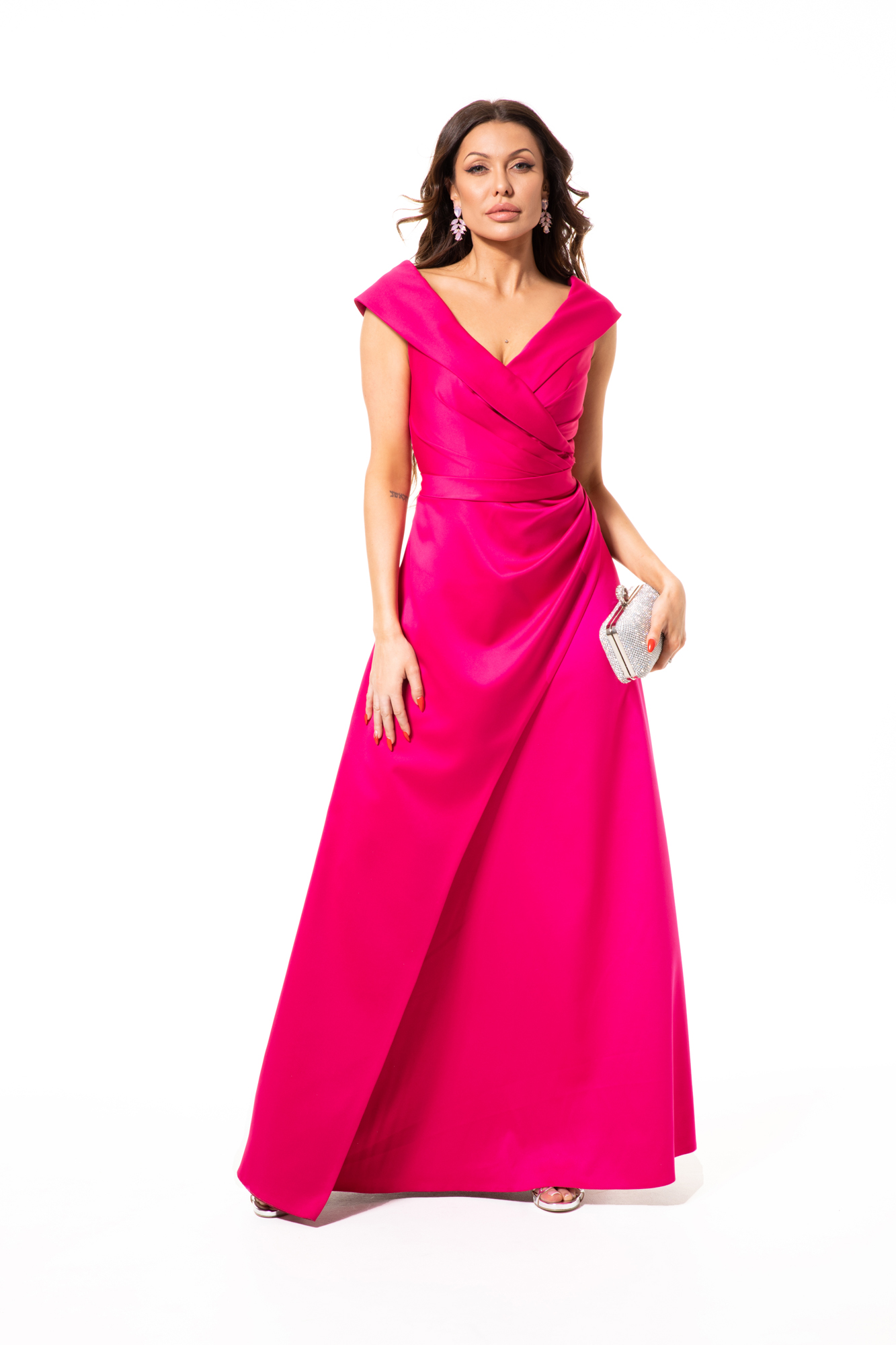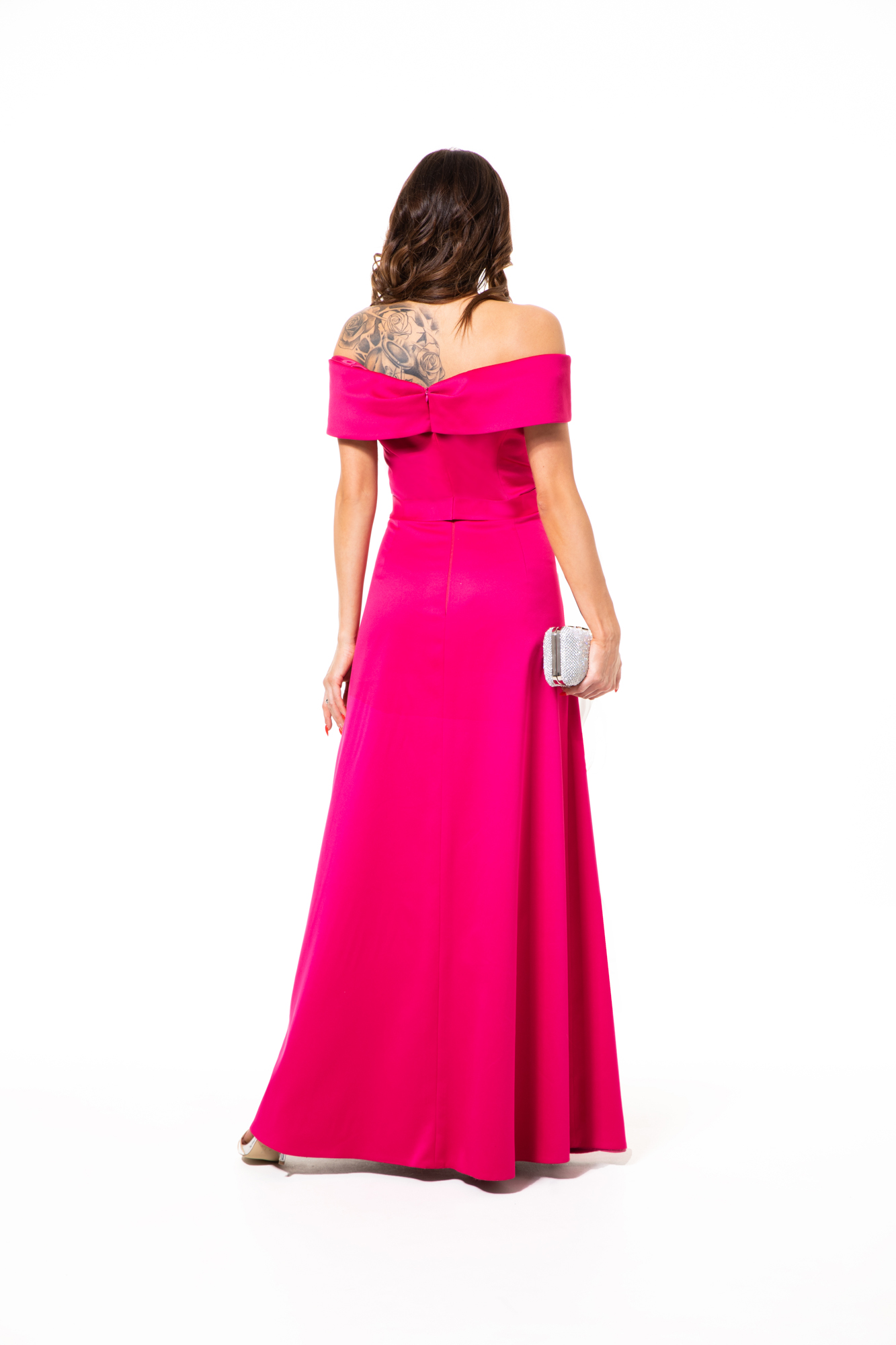 Suknia BOGNA – długa, satynowa suknia balowa w kształcie „litery A”. Góra sukni w formie „litery V” z kołnierzem, który lekko opada na ramiona. Na gorsecie drapowania, które dodatkowo modelują sylwetkę. Dół sukni z zakładką i drapowaniami sprawia, że jest ona bardziej oryginalna. Tkanina z której wykonana jest suknia występuję w wielu kolorach (czerwony, granatowy, czarny, szafir, róż) można więc ją dopasować do wielu okazji. Z racji tego, że suknia jest gładka można do niej dobrać wiele, różnych dodatków, począwszy od bogato zdobionych kolczyków, naszyjników, czy bransoletek po torebki i buty z błyszczących tkanin skończywszy.