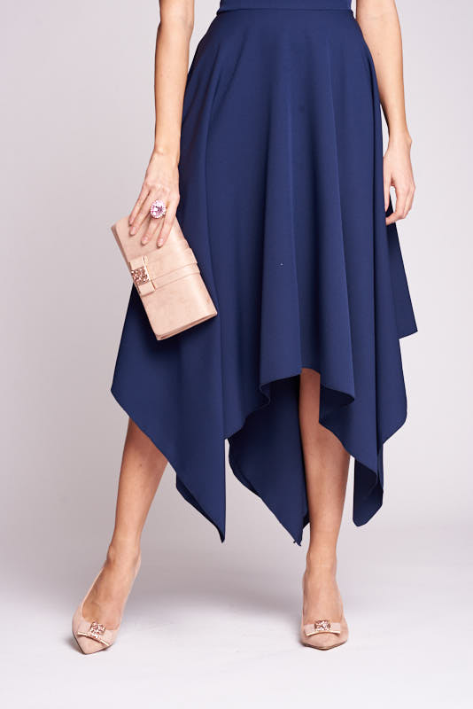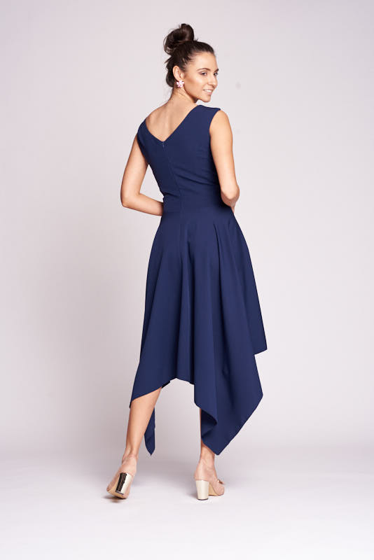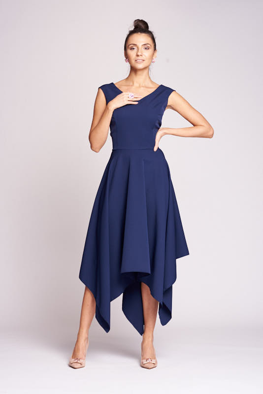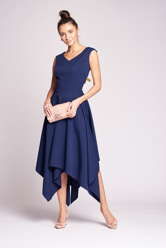 Suknia z charakterem, prostota formy, oryginalność kroju. Szerokie ramiączka tworzą dekolt w “V”, który wysmukla szyję. Cięcie w pasie akcentuje linię talii. Charakterystyczną cechą sukienki jest spódnica z asymetrycznie wydłużonymi bokami tworzącymi szpice. Gładkość sukni pozwala na nieograniczone możliwości doboru dodatków. Od subtelnych kolczyków z kryształów Swarovskiego i delikatnych sandałków po intensywne dodatki takie jak ozdobny pasek w talii oraz fascynator w kolorze granatu.
