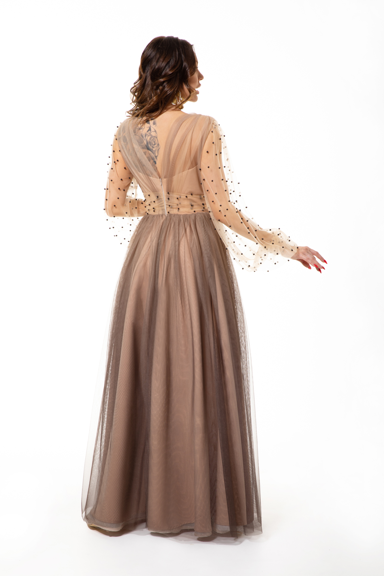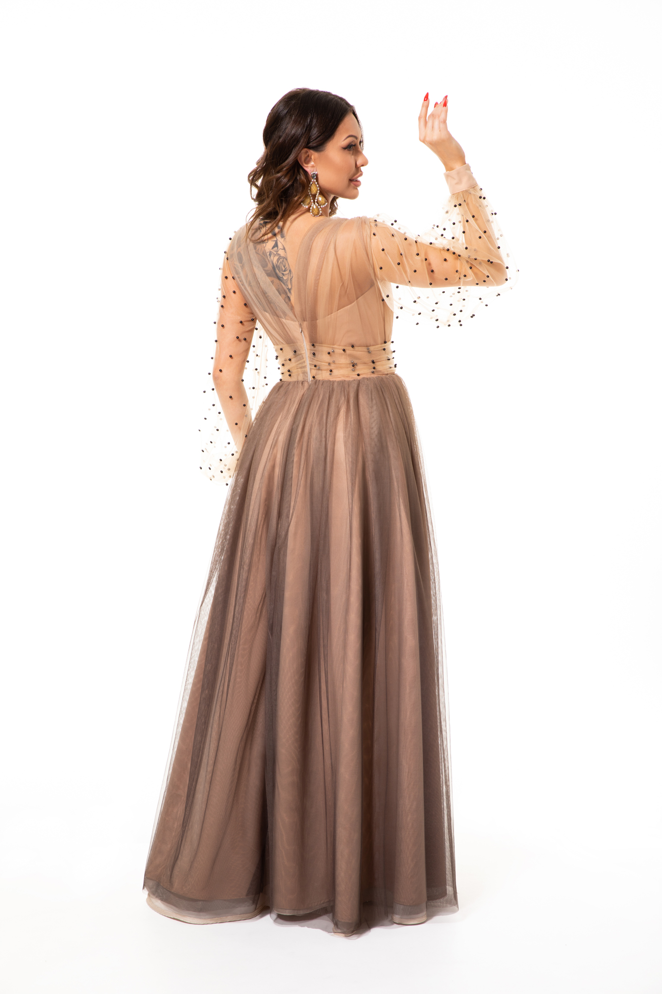 Suknia KLAUDIA – oryginalna, długa suknia w kształcie literki A. Góra sukni wykonana z beżowego marszczonego tiulu, dekolt w literkę V, który pięknie wysmukla szyję. Szerokie, transparentne tiulowe rękawy z mankietami ozdobione czarnymi koralikami delikatnie przykrywają ręce dodając jednocześnie sukni nowoczesności. W talii szeroki, marszczony pas wykonany z tej samej tkaniny co rękawy świetnie podkreśli każdą talię. Dół sukni dwukolorowy wykonany z beżowego i czarnego tiulu na złotym atłasie dodaje lekkości. Suknia nietuzinkowa ze względu na tkaninę nadaję się idealnie na wszelkiego rodzaju bale i imprezy okazjonalne takie jak wesela. Idealnym uzupełnieniem tej stylizacji będzie czarna biżuteria oraz dodatki w postaci butów i torebki.