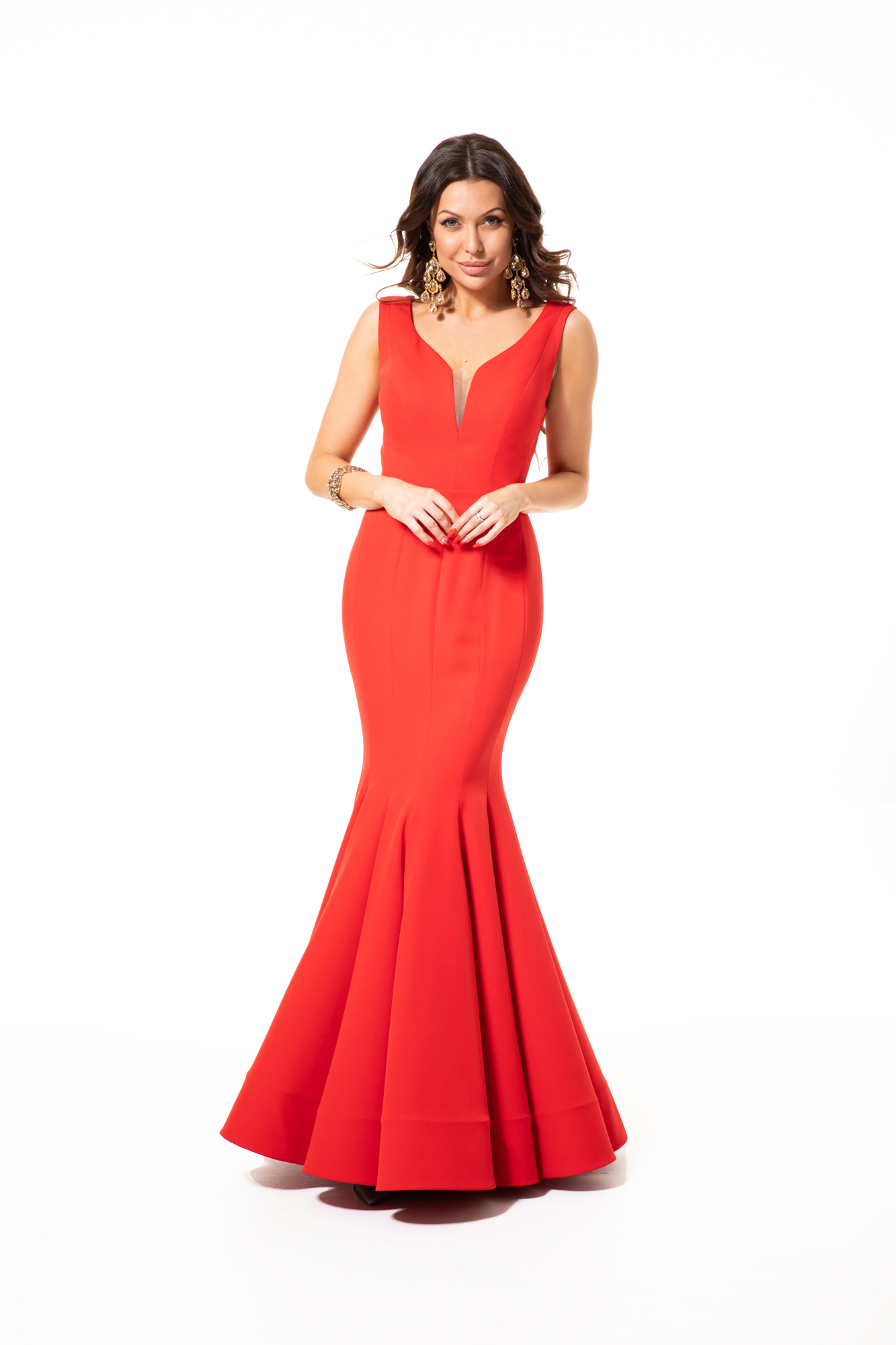 Suknia MALWINA – suknia w kształcie rybki, mocno eksponująca każdy element kobiecej sylwetki. Z przodu dekolt w kształcie „litery V” z tiulową wstawką pięknie podkreślający linię biustu. Na plecach również wycięcie w V które sprawia, że suknia robi się lekka. Dół sukni uszyty jest z klinów i posiada mocne zwężenie w kolanach dzięki czemu bardziej podkreśla biodra. Kliny tworzą klosz, który dzięki zastosowaniu krynoliny pięknie się układa i faluje podczas chodzenia. Klasyczna i elegancka suknia w ponadczasowym fasonie, którą można ozdobić mocno świecącymi kolczykami oraz bransoletką, a także dodać do niej błyszczącą torebkę.