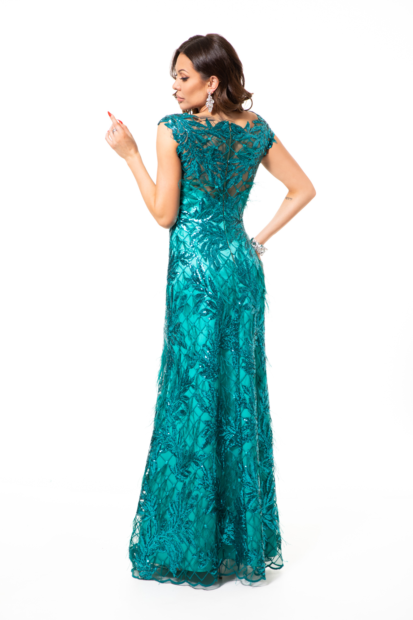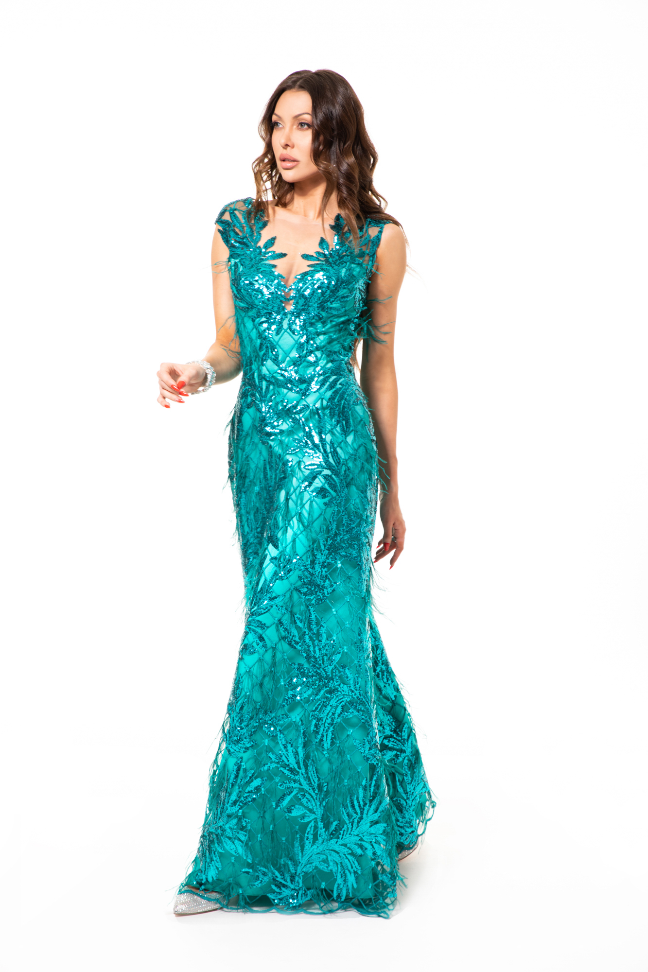 Suknia SZMARAGD – suknia w fasonie dopasowanym do linii bioder, lekko rozchodząca się w trapez ku dołowi. Szerokie ramiączka przechodzące w głęboki dekolt z przodu, pięknie wykończony elementami koronki. Plecy zabudowane koronką na tiulu, dające efekt przeźroczystości. Mocno zaakcentowana linia talii i bioder świetnie podkreśla kobiece kształty, natomiast lekko rozkloszowany dół nie ogranicza i nie krępuje ruchów. Suknia uszyta jest z satyny pokrytej oryginalną i nowoczesną koronką, łączącą w sobie zarówno wzory kwiatowe jak i geometryczne, obszyta cekinami i piórami. Nietuzinkowy kolor szmaragdowy sukni sprawia, że świetnie sprawdzi się ona na wieczorowe wyjścia jak i na wesela. Oryginalność sukni jeszcze bardziej podkreśli biżuteria z kryształów Swarovskiego.