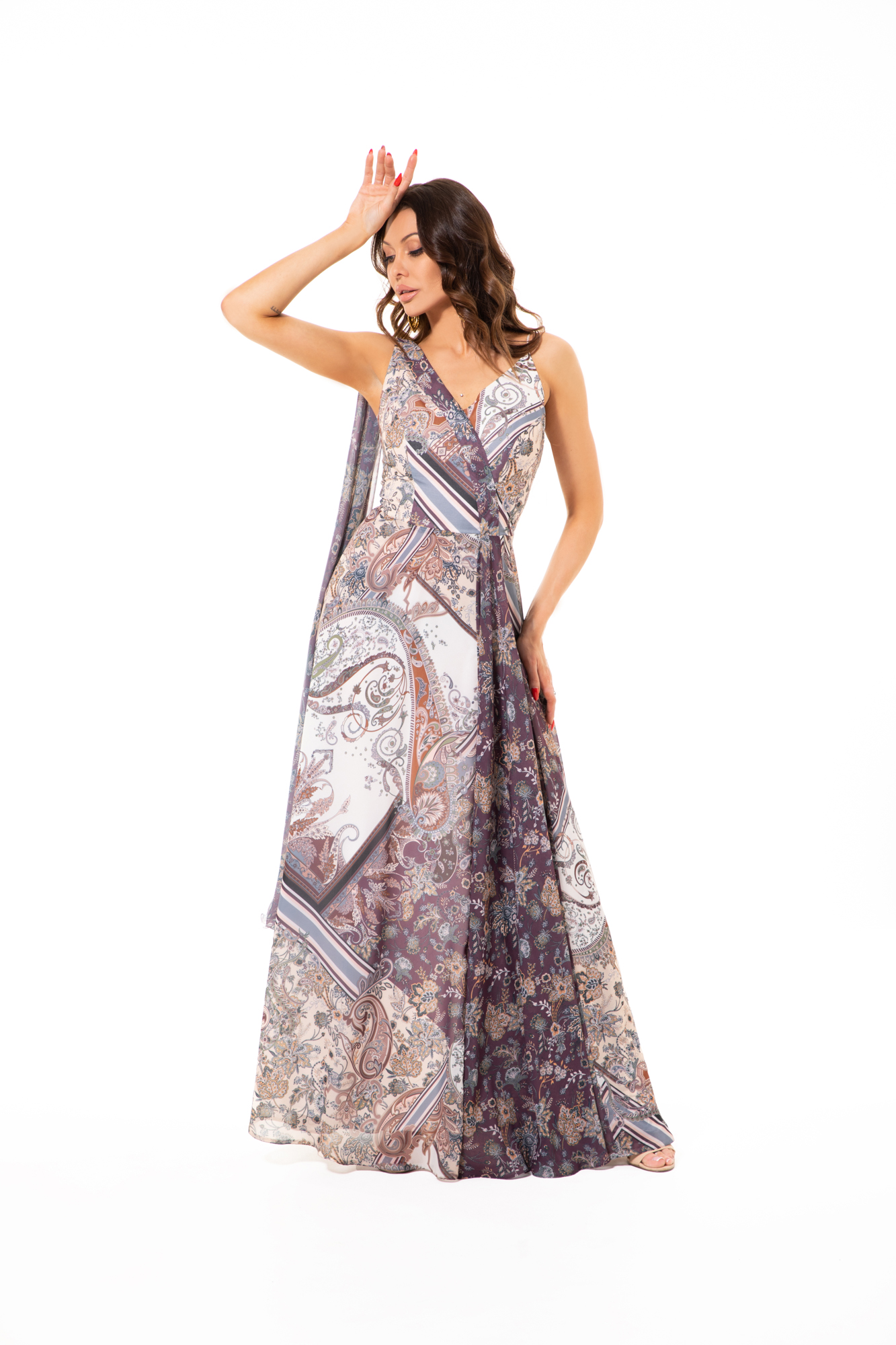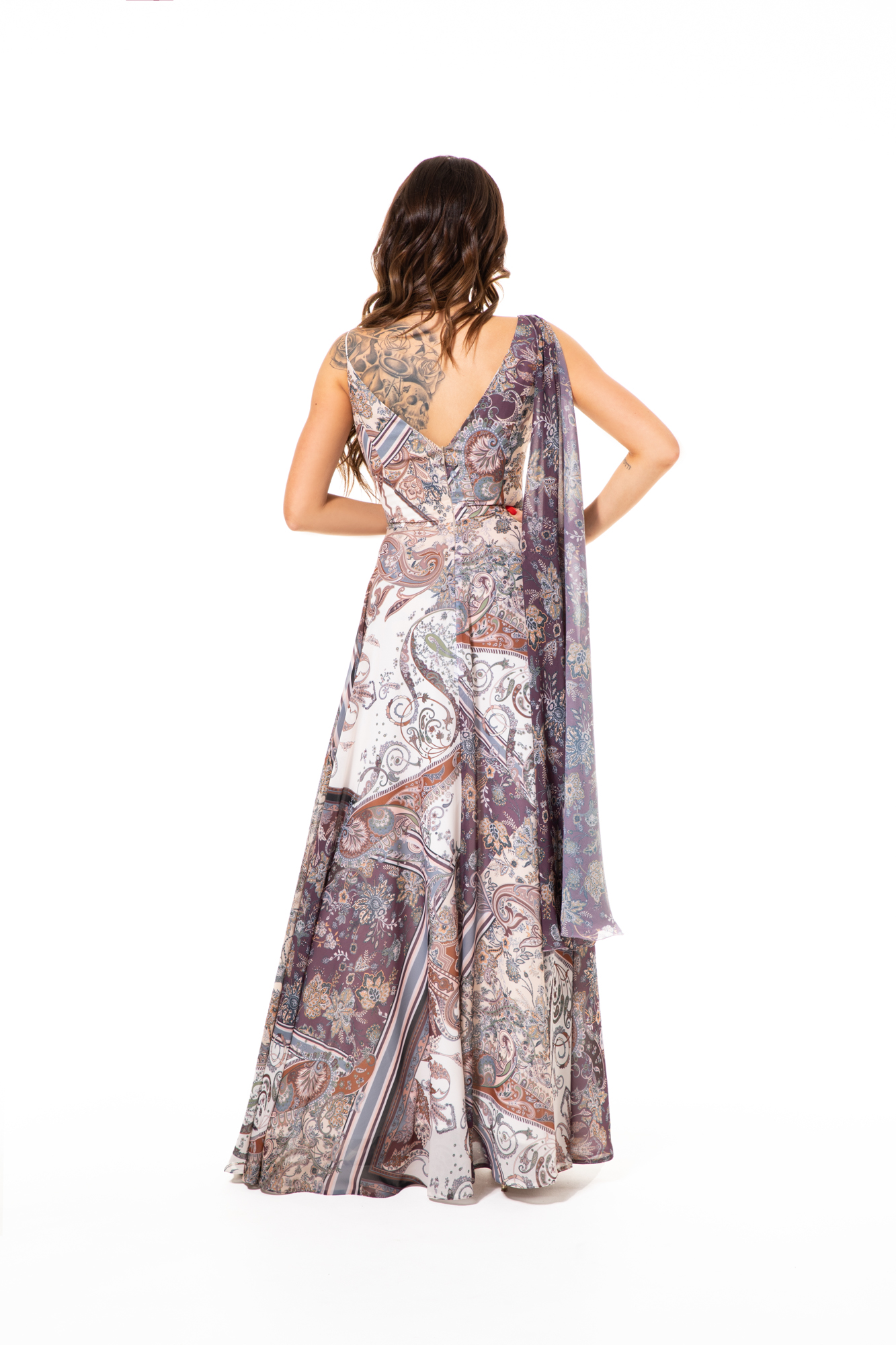 Suknia TAMARA – zwiewna sukienka uszyta z delikatnej tkaniny w kolorowy wzór orientalny. Dekolt w „literę V” z jednej strony wykończony ciemniejszą tkaniną, która przechodzi na plecy w fantazyjną szarfę, a ku dołowi sukienki w klin. Oryginalności tej sukni dodaje nie tylko sama tkanina, ale również efektowna szarfa z tyłu. Cienka, przewiewna tkanina idealnie nada się na wiosenno-letnie imprezy nie tylko wesela, a szeroka paleta barw, które pojawiają się na tkaninie daje duże możliwości jeśli chodzi o dobór dodatków.